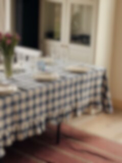 Duk i 100% ekologisk bomull med klassiskt rutigt mönster och en vacker volang . Fin att matcha med andra produkter i samma serie