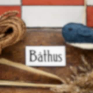 Plåtskylt i emaljfinish med texten "Båthus". Två alternativ för upphängning; antingen med medföljande dubbelhäftande etikett eller med spik i skyltens två hål.