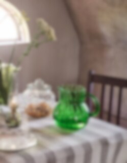 En elegant glaskanna i en livfullt grön färg med räfflad design och praktiskt handtag. Tyra kombinerar funktion och form på ett stilfullt sätt - perfekt för att servera vatten, lemonad eller som en dekorativ vas till blommor.