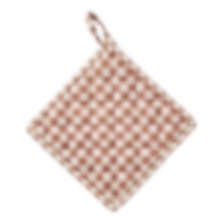 Rutig grytlapp i vitt och rostrött, ögla för upphängning.