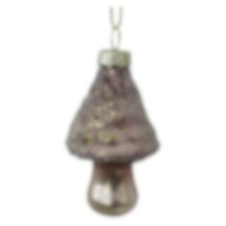 Vacker rödlila julkula med formen av en svamp. Tillverkad i glas. Guldtråd för upphängning i gran.
