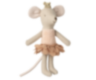 Lillasyster mus pinsessa i sin ask med säng. Hon är klädd i en fin guldig krona och en persikofärgad klänning.