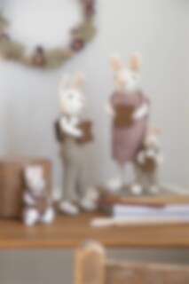 En stor tovad kanin med lila klänning, ryggsäck och en liten bok, från Gry & Sif. Fin att ställa tillsammans med andra figurer från Gry & Sif.