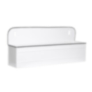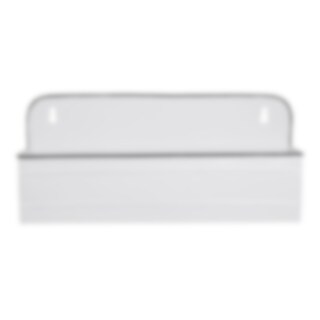 Låda för vägg i vitlackerad plåt med grå kant. Använd för förvaring av diskborstar och rengöringsmedel i köket till exempel. Två hål för upphängning.