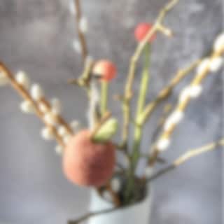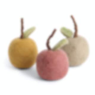 Set med söta, tovade äpplen i tre färger, rosa, gul och beige, från Gry & Sif. Designade i Danmark och Fairtrade-handgjorda av 100% ren ull från Nya Zealand av kvinnor i Nepal. Fin dekoration i barnrummet eller påskriset.
