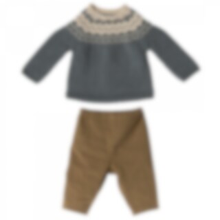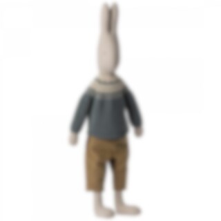 En söt kanin från Maileg iklädd bruna byxor och en blå stickad tröja. En perfekt liten kompis för de små att leka med.
