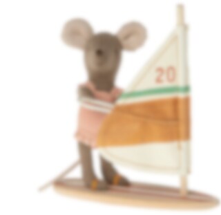 Surfande lillasyster mus i baddräkt med surfbräda.