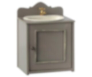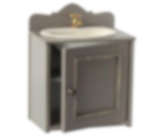 Gulligt litet tvättställ i vintagestil passande till dockhus och Mailegs mindre kaniner och möss. Vackert med guldig vattentapp, metallho och träskåp.