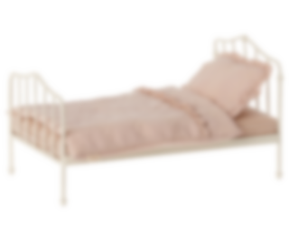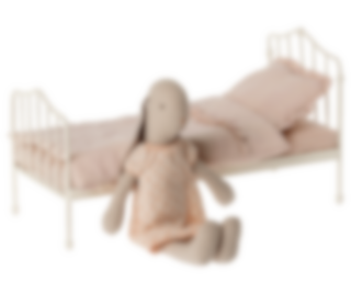 En liten vit metallsäng med rosa sängkläder som passar perfekt till de mindre kaninerna. Mjukt sänglinne håller kompisen varm hela natten. Rosa madrass samt täcke och kudde i rutigt mönster.