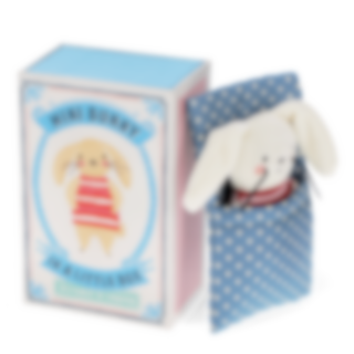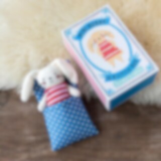 Denna kanin kommer i en robust låda designad som en vintage tändsticksask. Barn kan stoppa in sin nya kompis och sedan stänga in honom säkert för natten.