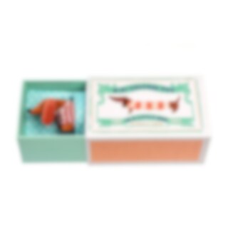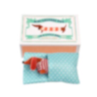 En söt och mjuk miniatyrtax som bär en röd- och vitrandig tröja. Levereras med en blå prickig filt, instoppad i en fin illustrerad presentask.