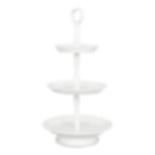 Vitt kakfat i tre våningar med dekorativa prickiga kanter. Perfekt som tårtfat eller servering till buffén. Handtag högst upp för lätt förflyttning.