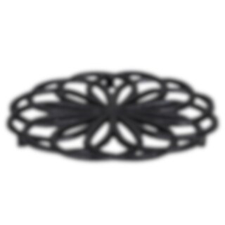 Rustikt grytunderlägg med dekorativt blommönster i svart gjutjärn för grytor och kastruller. Fin att hänga upp på väggen som köksdekoration när underlägget inte envänds.