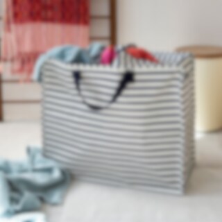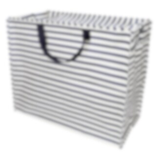 Förvaringspåse av stark och hållbar återvunnen plast med horisontella marinblå ränder på vit bakgrund, som frammanar en kustnära, sjöfartsmässig estetik. Passande till tvätt eller leksaker. Lätt att vika ihop platt när den inte används.
