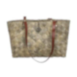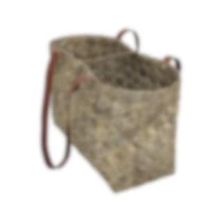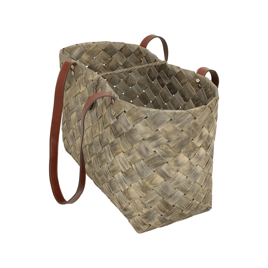 Spånväska i flätat grått trä med handtag i fuskläder. Stängs med hjälp av ett jutesnöre och knapp.