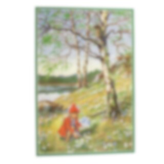 Gammaldags pappersbonad med motiv av Jenny Nyström. Motivet visar en flicka som plockar vitsipppor vid en sjö, runt motivet finns en grön ram. En vacker vårbonad att dekorera alla rum med för en mysig och härlig känsla.