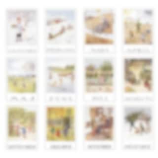 12 härliga månadsbilder med motiv hämtade ur Elsa Beskows klassiska bilderbok "Årets saga" från år 1927. Kommer i en fin presentmapp med gummiband.