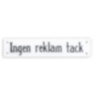 Plåtskylt i emaljfinish med texten "Ingen Reklam Tack". Två alternativ för upphängning; antingen med medföljande dubbelhäftande etikett eller med spik i skyltens hål.