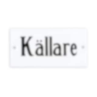 Plåtskylt i emaljfinish med texten "Källare". Två alternativ för upphängning; antingen med medföljande dubbelhäftande etikett eller med spik i skyltens två hål.