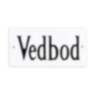 Plåtskylt i emaljfinish med texten "Vedbod". Två alternativ för upphängning; antingen med medföljande dubbelhäftande etikett eller med spik i skyltens två hål.
