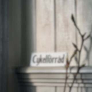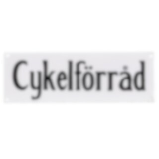 Plåtskylt i emaljfinish med texten "Cykelförråd". Två alternativ för upphängning; antingen med medföljande dubbelhäftande etikett eller med spik i skyltens två hål.
