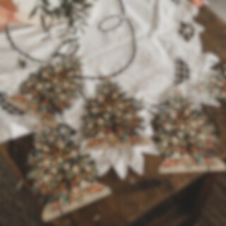 Girlangen består av 05 julgranar som mäter 11,5 × 16,5 cm vardera. Längden på snöret är 1,2 m. Dubbelsidigt tryck.
