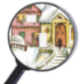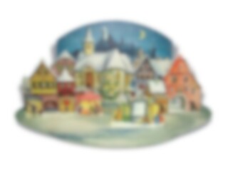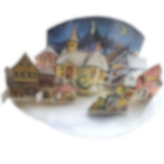 Uppfällbar julkalender i 3D med 24 luckor. Nytryck med motiv av en gammaldags stad i månskenet från år 1955.