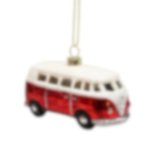 Vacker julkula i glas som föreställer en VW-buss i rött och vitt. Detaljrikt dekorerad med glitter. Guldtråd för upphängning i granen.