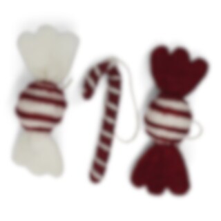 Tre söta karameller från Gry & Sif att hänga i granen. Designade i Danmark och Fairtrade-handgjorda av 100% ren ull från Nya Zealand av kvinnor i Nepal.
