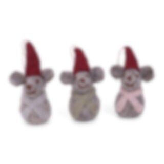 Tre gulliga, tovade möss från Gry & Sif att hänga i granen. Designade i Danmark och Fairtrade-handgjorda av 100% ren ull från Nya Zealand av kvinnor i Nepal.