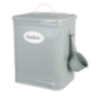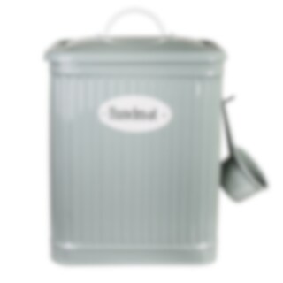 Plåtburk i grönt med skylt i vitt och texten "Hundmat". En skopa som kan hängas på sidan medföljer. Från plåtburksserien Hugo från Strömshaga.