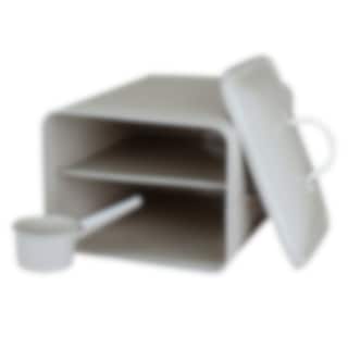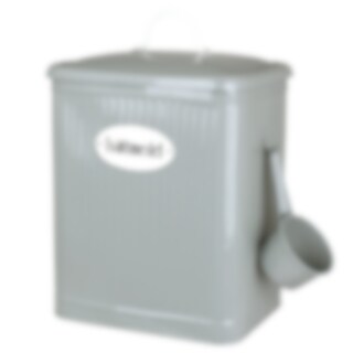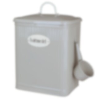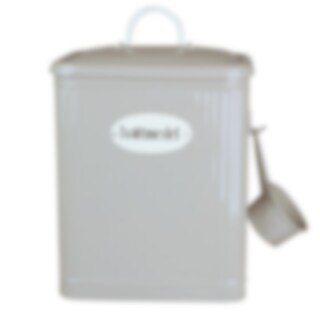 Plåtburk i beige med skylt i vitt och texten Tvättmedel. En skopa som kan hängas på sidan medföljer. Två fack för olika typ av tvättmedel. Från plåtburksserien Hugo från Strömshaga.