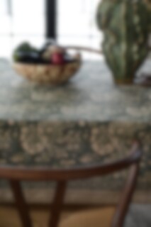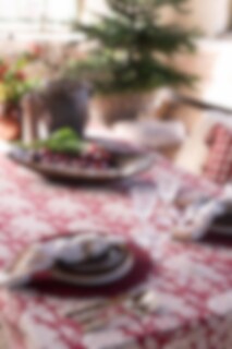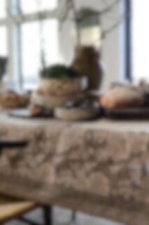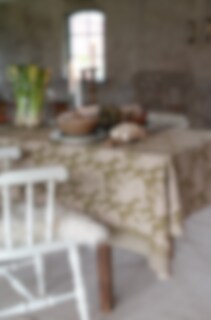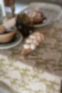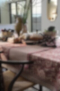 Duk i bomull med ett magnifikt mönster och vacker bård längs långsidorna. En duk i ljuva färger som förhöjer rummets atmosfär.