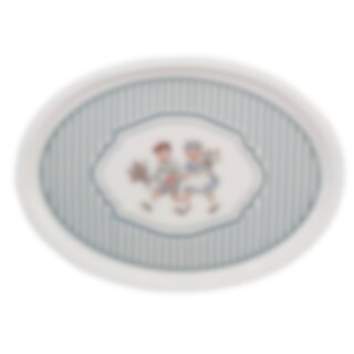 Oval bricka i off-white med blåa ränder och ett charmigt motiv av två barn som håller i varsin blombukett. Brickan är tillverkad av slitstarkt material med en slät, lättavtorkad yta. Kan torkas av med en fuktig trasa.