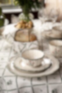 Duk i 100% ekologisk bomull med ett bedårande mönster av detaljerat ritade rutor av blad och små gröna blommor. Fint att kombinera tillsammans med de andra textila delarna i Lovisa-serien.
