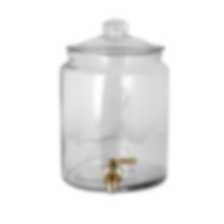 Glasburk med lock och mässingfärgad kran i rostfritt stål. Rymmer ca 6 liter. Lämplig för isvatten, lemonad, isté eller saft. Stor öppning som underlättar påfyllning av is och dryck. Tättslutande lock.