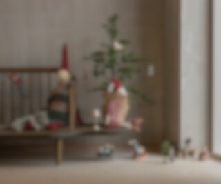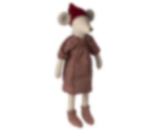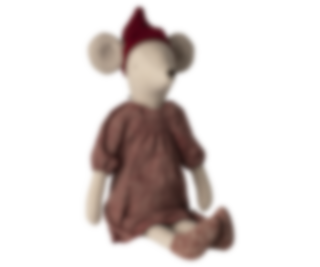 En söt julmus klädd i en röd klänning, tomteluva och raggsockor, som är redo för julmys! Passar alla åldrar.