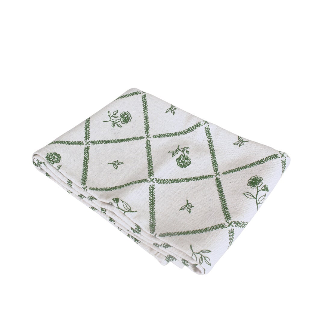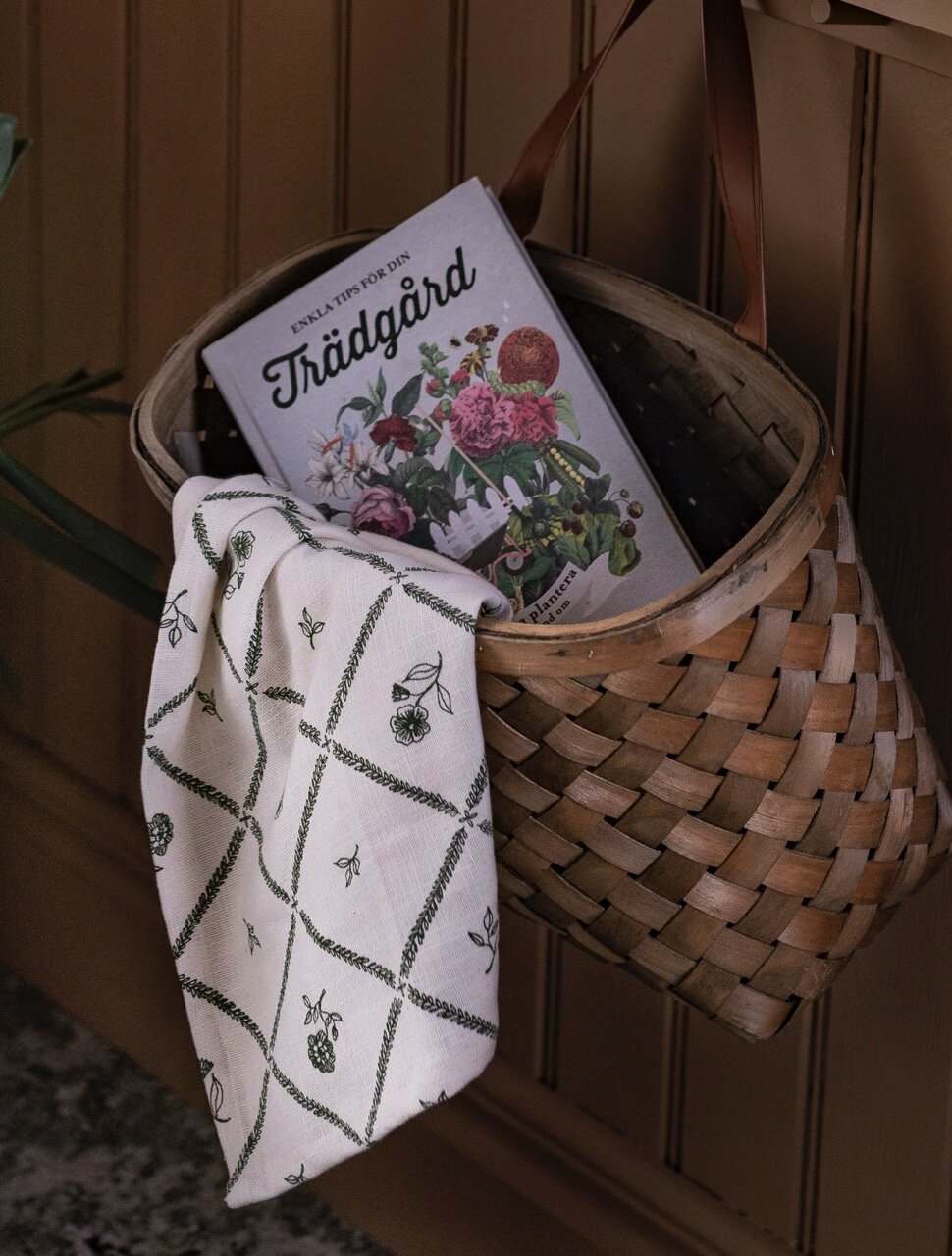 Kökshandduk i 100% ekologisk bomull med ett bedårande mönster av detaljerat ritade rutor av blad och små gröna blommor. Fint att kombinera tillsammans med de andra textila delarna i Lovisa-serien.