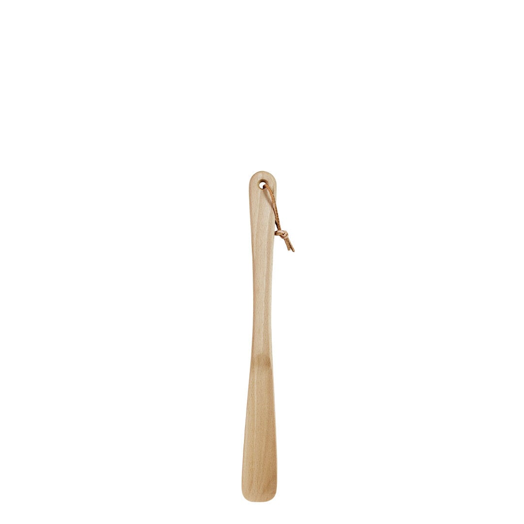 Litet, klassiskt skohorn tillverkad av FSC-märkt bokträ. Hål och läderband för upphängning.