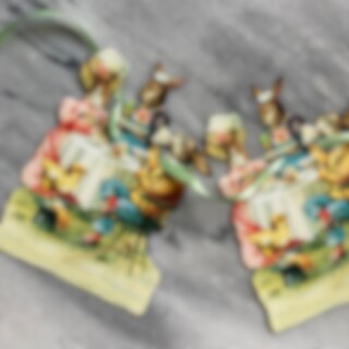 Girland med motiv av harar och en söt liten kyckling, dubbelsidigt tryck. Figurernas mått är 11,5 × 16,5 cm med totalt 5 motiv.
