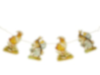 Girland med motiv av en påskhare och en söt liten kyckling, enkelsidigt tryck. Figurernas mått är 11 × 16 cm och gilrlanden är 3 meter lång med totalt sex motiv.