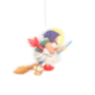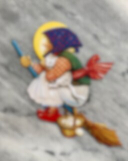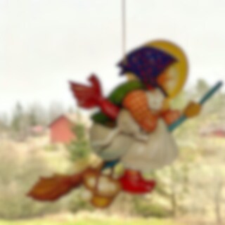 Dubbelsidig påskdekoration i papp med en påskkärring på kvast med en korg full av ägg och en vit katt under armen på väg till blåkulla. Tillverkad i Sverige