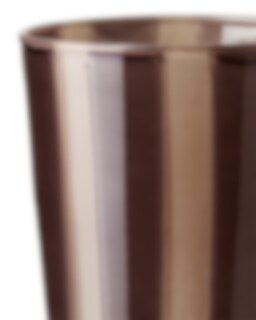 Liten ljuslykta i glas med beiga och vinröda ränder, passar för värmeljus.