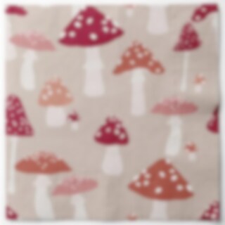 Underbara servetter i papper, med motiv av flera flugsvampar i olika röda nyanser.