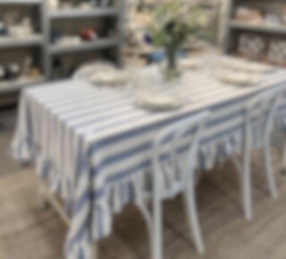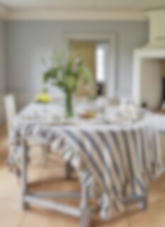 Duk i 100% ekologisk bomull med klassiskt bredrandigt mönster och en vacker volang. Fin att matcha med andra produkter i samma serie.
