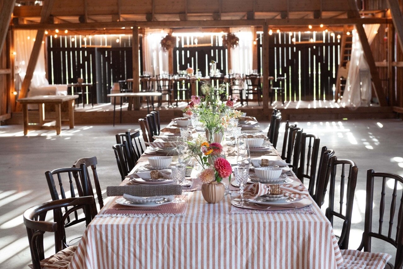 En randig duk i en ljuvlig rosa ton. Ett elegant och stilfullt tillägg till din bordsdukning.