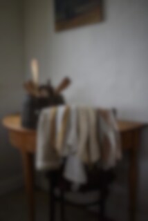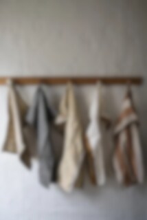 Fin kökshandduk med smala ränder i beiga och ockrafärgade toner.
