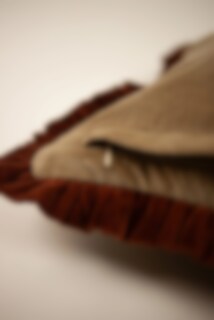 Ljuvligt kuddfodral i beige sammet med rostbrun volang.