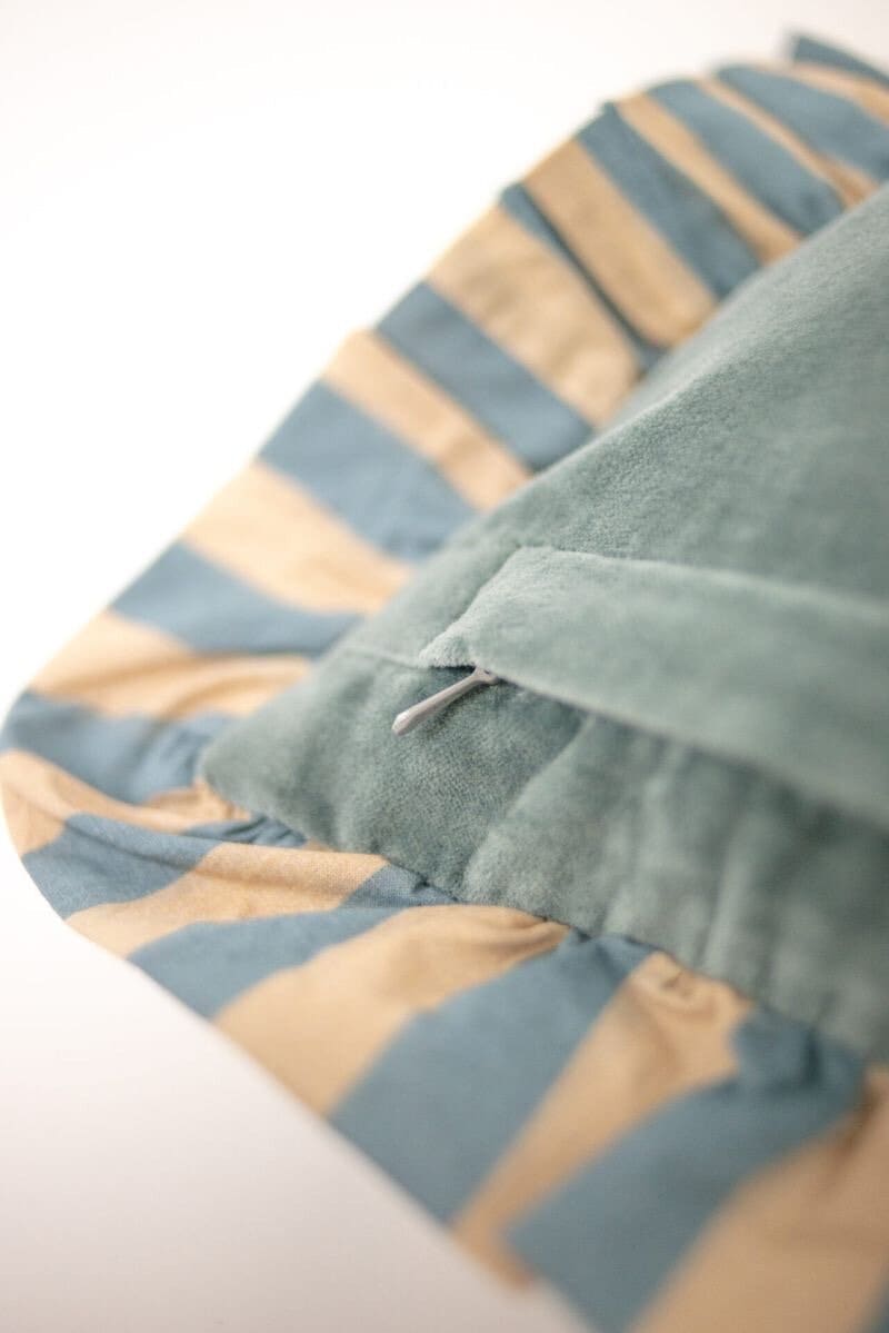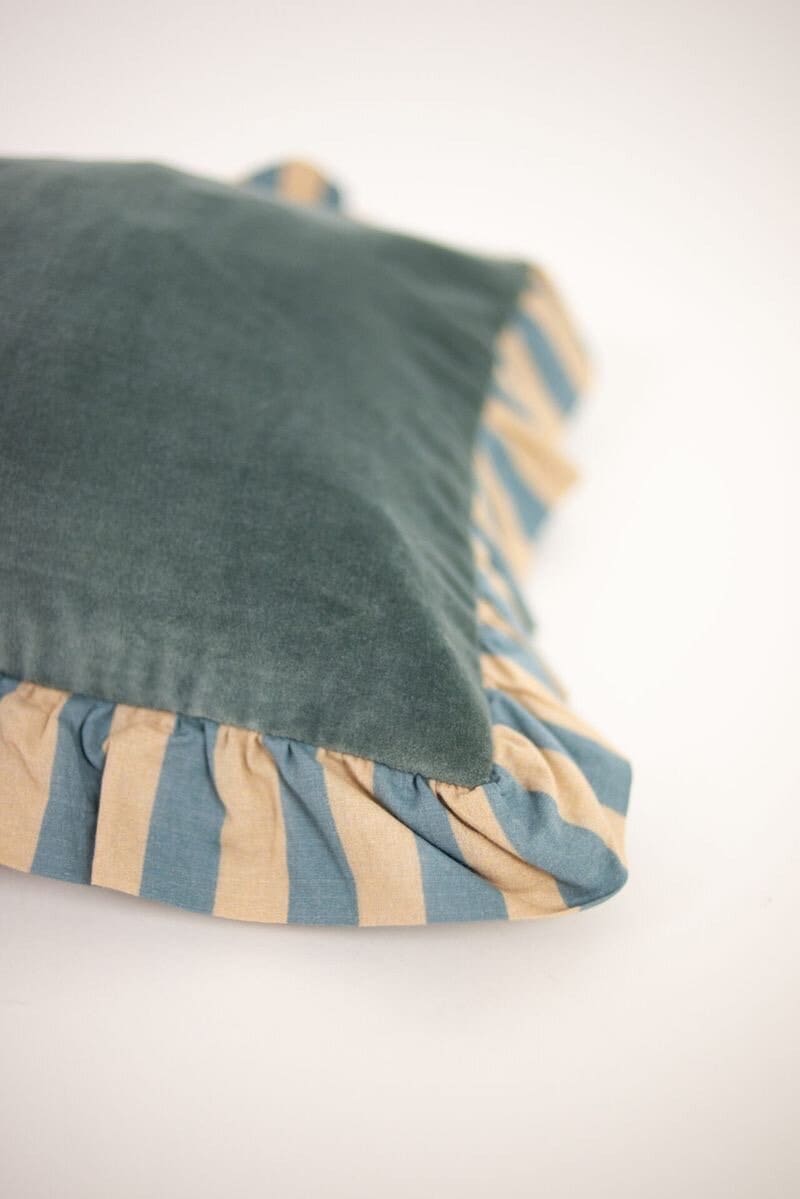 Ljuvligt kuddfodral i blå sammet med blårandig volang.