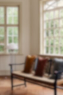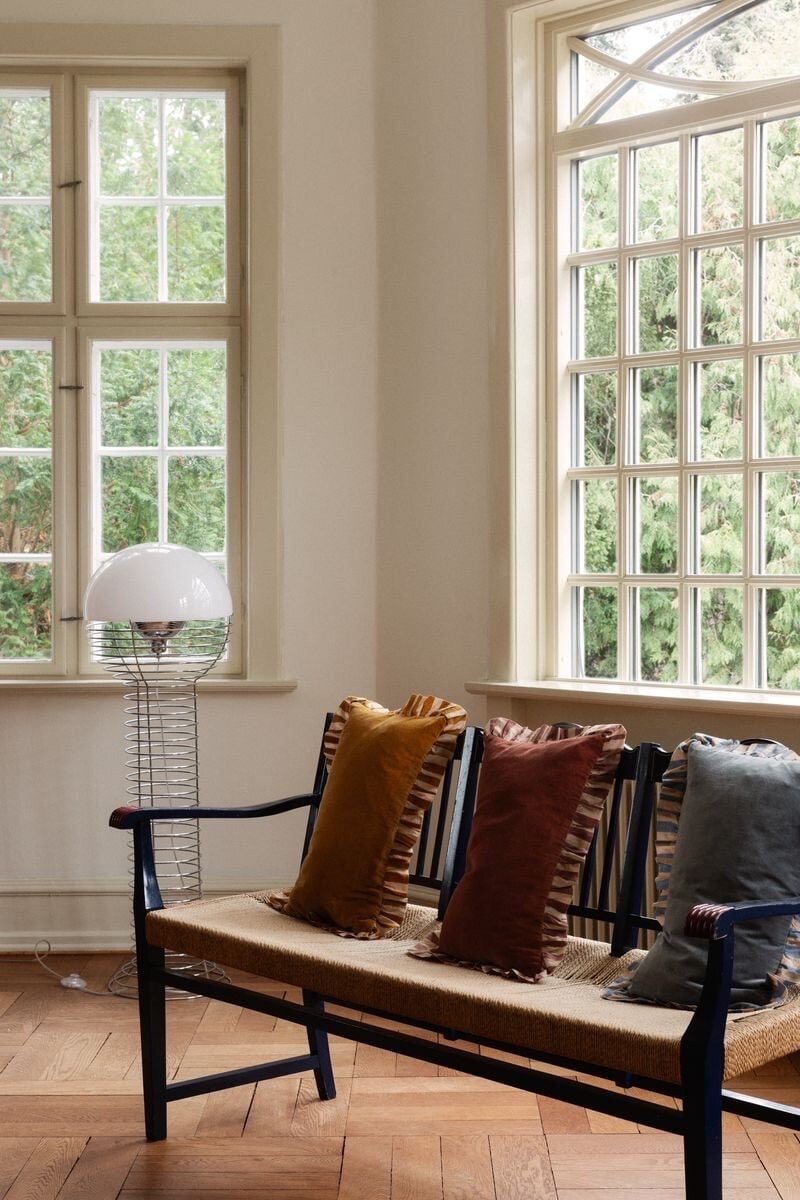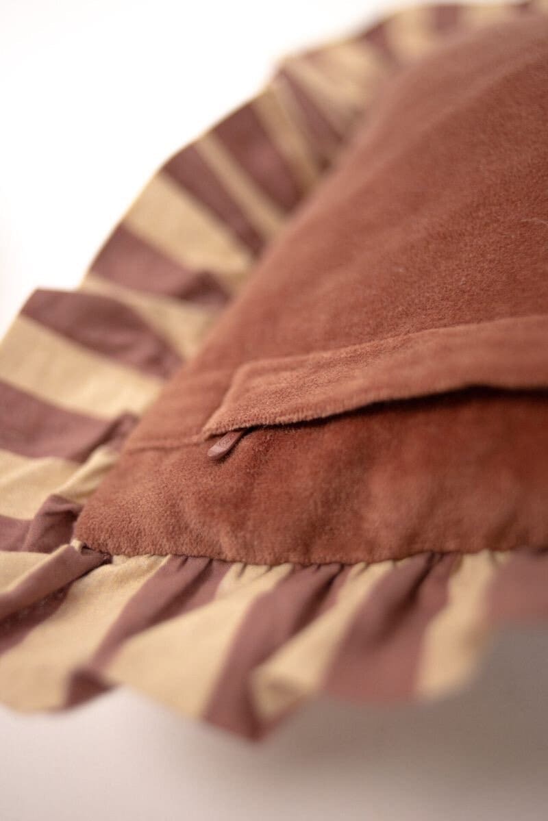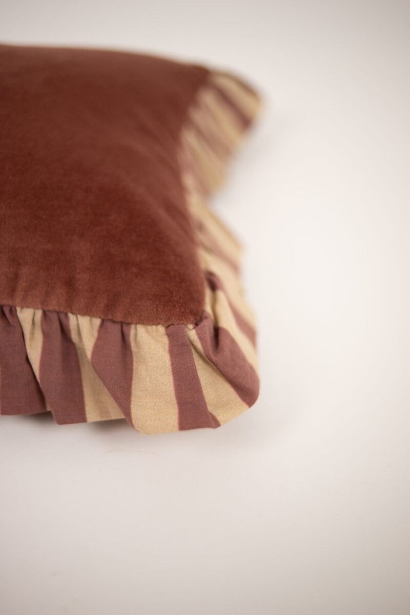 Ljuvligt kuddfodral i rosa sammet med rosa-randig volang.